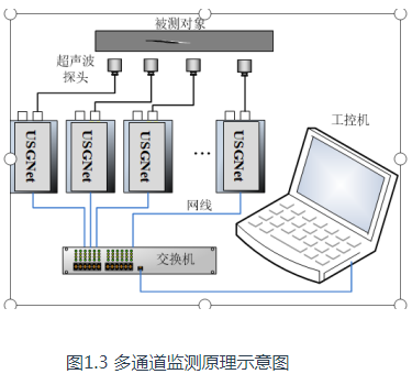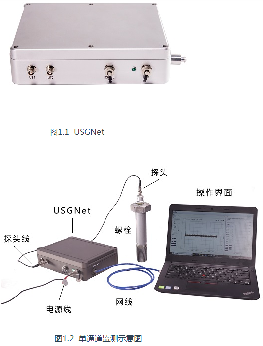 USGNet還提供了功能豐富的二次開發(fā)工具包,可自主開發(fā)應(yīng)用軟件,展現(xiàn)個性化應(yīng)力測量需求。圖1.2和圖1.3分別是單通道和多通道組合檢測連接示意圖。
