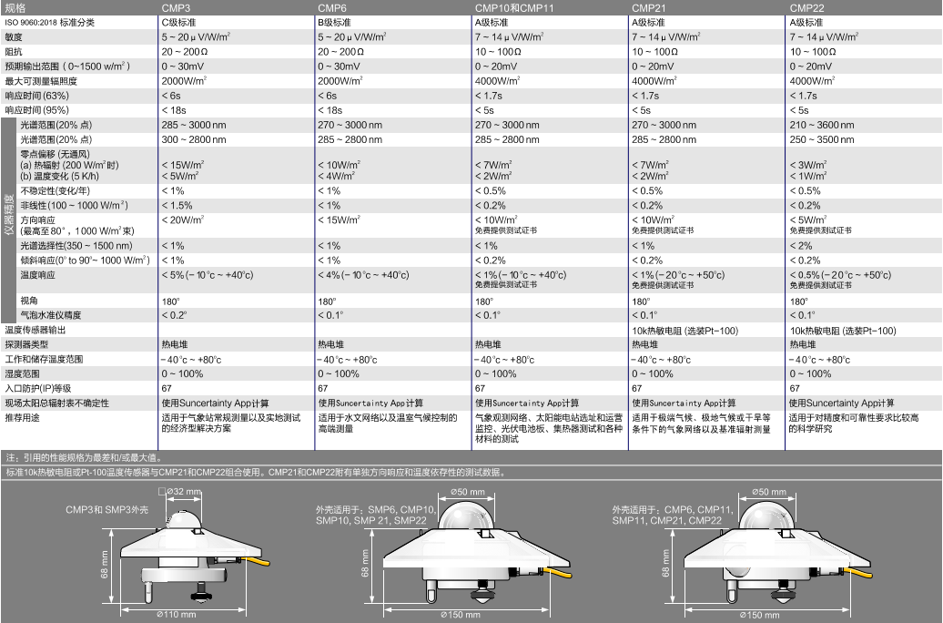 CMP6的探測原件與CMP3類似,但是性能有所改進,增加了熱質量并采用雙玻璃圓頂構造。優質但同時具備性價比的特點,使得本款產品可適用于水文觀測網絡和農業等領域的測量操作。