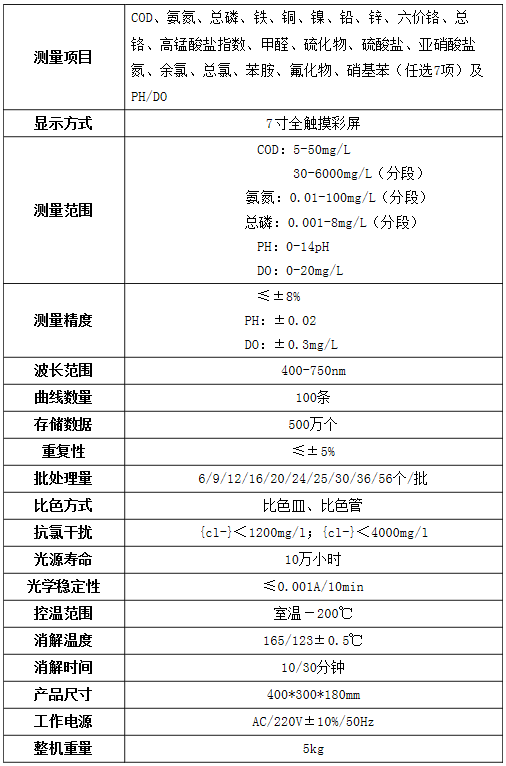 準確測定各種水體中的化學需氧量(COD)、氨氮、總磷、鐵、銅、鎳、鉛、鋅、六價鉻、總鉻、高猛酸鹽指數、甲醛、硫化物、硫酸鹽、亞硝酸鹽氮、余氯、苯胺、氟化物、硝基苯(任選7項)及PH/DO等指標