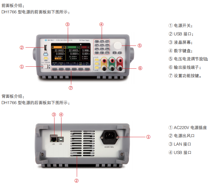 大華電子 DH1766 系列線性三路可編程直流電源 面板說明: