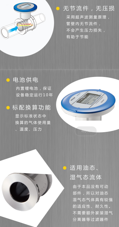 采用超聲波時差法準(zhǔn)確測量氣體流量,耐腐蝕,穩(wěn)定可靠,精度高廣泛應(yīng)用于各種氣體流量的測量。無節(jié)流件,無壓力損失,可對壓力不到1MPa的空氣進行流量測量。可選擇螺紋式、對夾式法蘭或者是法蘭的連接方式。可提供鋰電池供電無需布線