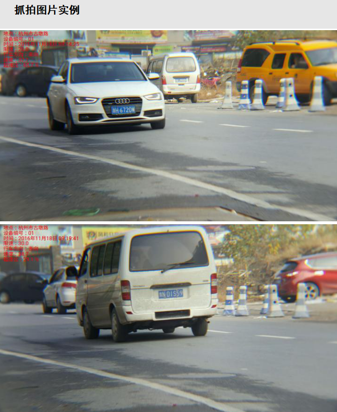 抓拍到的照片上自動疊加有日期,時間,規(guī)定限制速度,目標速度、超速比率、行車方向等信息,*對完全滿足當前道路交通管理的應用需要。