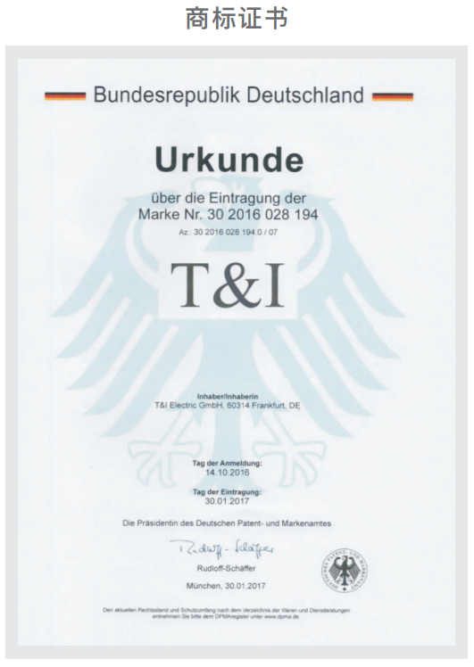 T&I 電氣有限公司( T&I Electric GmbH )是一家專門從事電力科技產(chǎn)品研發(fā)生產(chǎn)的高新技術(shù)企業(yè),總部位于德國法蘭克福,致力于為電力、鐵路、通信、石油石化、市政管網(wǎng)、建筑工程等行業(yè)提供專業(yè)的管網(wǎng)運行維護、封堵系統(tǒng)解決方案。