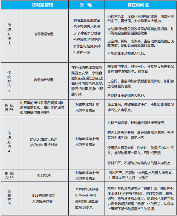 針對開關(guān)柜、配電柜、環(huán)網(wǎng)柜等電力設(shè)備出現(xiàn)的“受潮和凝露問題”,我們提出了“氣密封堵”的概念,采用領(lǐng)先于世界水平的“自流平膨脹技術(shù)”及“高分子自固化技術(shù)”,從根源上解決問題。從方案設(shè)計到現(xiàn)場施工以及后期維護一站式解決終端用戶的防凝露問題。