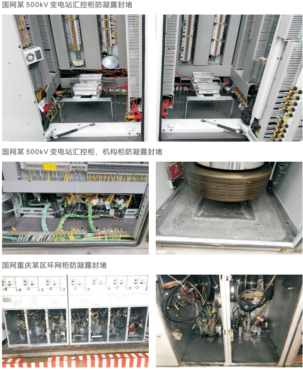 在電網(wǎng)設(shè)備中,環(huán)網(wǎng)柜、開關(guān)柜、端子箱等室內(nèi)外電氣柜受潮、形成凝露等危害十分嚴(yán)重,過去采用的除濕器、加熱器等有源方法存在各種各樣的問題,治標(biāo)不治本。原始的封堵方法也存在很多問題。“無源化”的電力設(shè)備防潮防凝露治理方案成為一種新型解決方案,在實際應(yīng)用中效果明顯,填補了國際和國內(nèi)在此領(lǐng)域的技術(shù)空白。在電氣柜底板及電纜夾層(隧道)進行氣密封堵,將電纜周圍的孔洞、縫隙進行密封處理,氣體無法穿越結(jié)構(gòu)件的密封,可以有效阻止潮氣、煙氣、毒氣與液態(tài)水通過,從根本上阻斷了潮氣和凝露產(chǎn)生的源頭。
