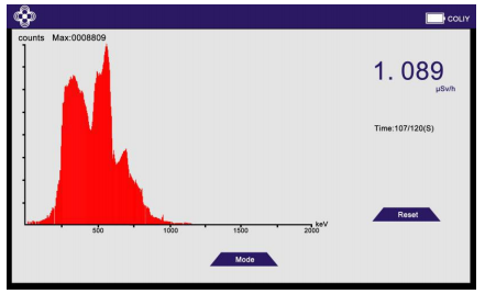 同時顯示能譜圖、計數(shù)、劑量率值和采樣時間等。