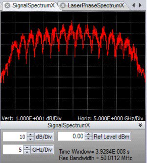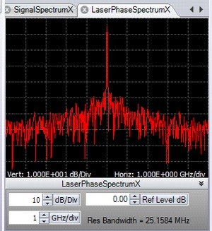 校正后的電場隨時(shí)間變化的FFT可以揭示很多有關(guān)數(shù)據(jù)信號(hào)的信息。頻譜不對(duì)稱或偏移可能表明激光頻率誤差過大。頻譜的周期性顯示數(shù)據(jù)支路之間的相關(guān)性。激光相位與時(shí)間數(shù)據(jù)的FFT可用于測量激光相位噪聲。