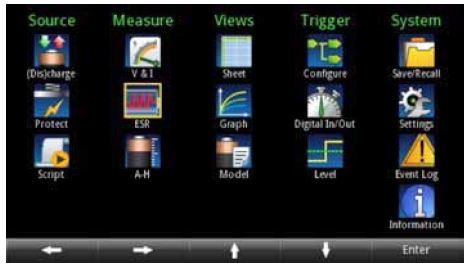 高亮度4.3 英寸TFT 顯示器用大的易讀字符顯示電壓、電流 和安時讀數、源設置及許多其他設置?;趫D標的主菜單提 供了用戶可以控制和設置的所有功能,可以快速進入源設置、 測量設置、顯示格式、觸發選項和系統設置。菜單簡短,所 有選項容易查找且描述清楚,可以使用導航輪、數字鍵盤或 軟鍵迅速設置測試參數。許多設置參數,如電壓和電流設置, 可以直接從主屏輸入;不復雜的測試無需進入主菜單進行設 置,就可以在主屏上使用軟菜單進行調節。不管測試要求簡 單還是復雜,Series 2281S 電源都為設置所有要求的參數提 供了一種簡便方式。