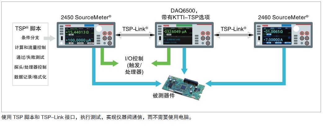 TSP? 技術還提供了無主機通道擴容功能。KTTI-TSP 是一種用戶可以自行安裝的附件卡,可以連接 TSP-Link 技術。這種通道擴展總線可以把多臺 DMM6510、支持 TSP 的其他儀器、任何基于LAN 的儀器連接在一起,構成一個緊密同步的儀器系統(tǒng)。連接使用簡單的低價五類以太網(wǎng)線纜實現(xiàn)。系統(tǒng)采用主從配置,互連的多臺儀器基本上可以作為一個系統(tǒng)操作。支持 TSP 的其他吉時利儀器有:2450 和 2460 圖形源表源測量單元 (SMU) 儀器、Series 2600B 源 表 (SMU) 儀 器 、 DMM7510 、 DMM6510 和 Series 3700A 開關 / 萬用表系統(tǒng)。TSP-Link 技術支持最多 32 臺儀器,因此可以簡便地進行系統(tǒng)擴容,滿足應用要求。