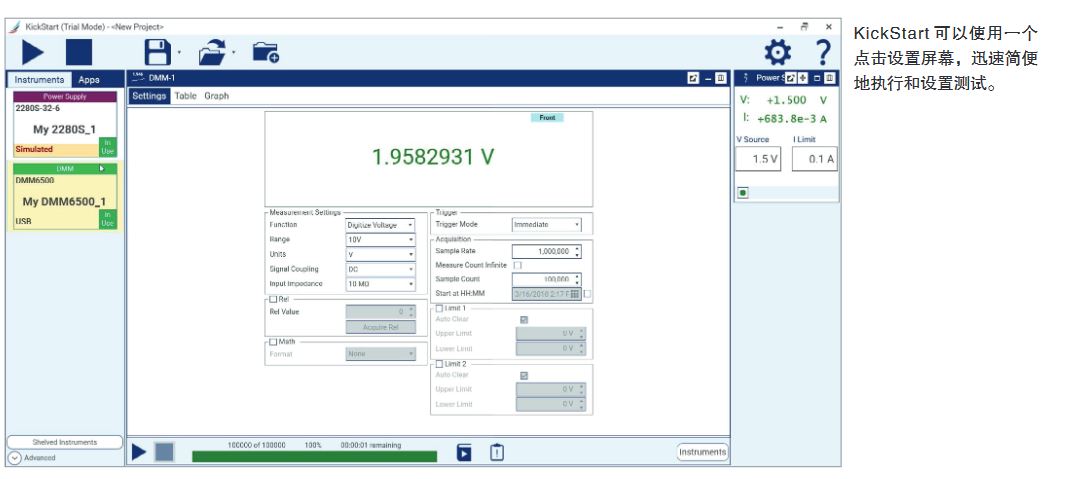 KickStart 可以配置、測試及從多臺儀器采集數(shù)據(jù),包括 DMM、電源、SMU 儀器和數(shù)據(jù)記錄器。您可以同時控制最多 8 臺儀器,從每臺儀器中檢索數(shù)百萬個讀數(shù)。這使得 KickStart 成為一個優(yōu)異的解決方案,可以滿足數(shù)據(jù)記錄需求,使用模數(shù)轉換 DMM 從瞬態(tài)事件中捕獲大量數(shù)據(jù)。