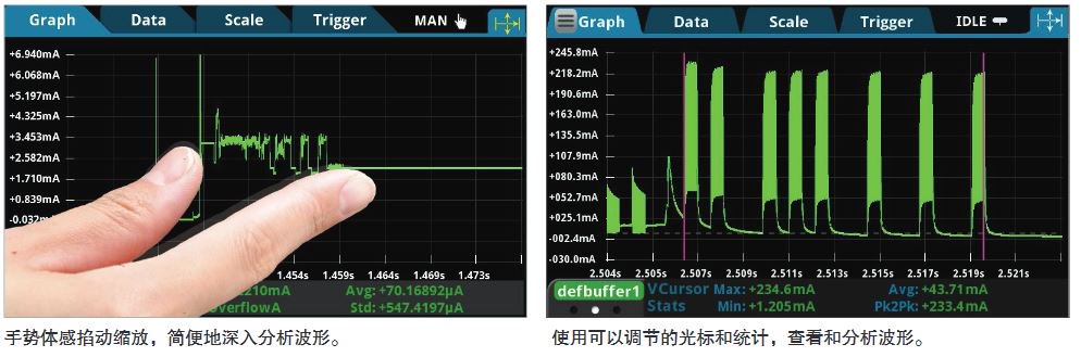 A/D 轉換器,可以用來執(zhí)行電壓或電流測量,特別適合捕獲瞬態(tài)異常信號,或幫助繪制功率事件曲線,比如當今電池供電的器件的工作狀態(tài)。電流和電壓可以使用可編程 1MS/s 16 位模數(shù)轉換器進行模數(shù)轉換,可以直接采集波形,而不用使用單獨的儀器。