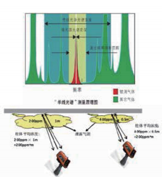 測量時,利用了甲烷氣體對某一特定波長激光的吸收特性。當激光束指向探測目標如:路面、氣體管道等時,如果這些物體產生了甲烷泄漏氣團,將從目標目標氣團會反射回來散射的激光。探測器接收到反射回的激光的二次諧波并測量其吸收率,吸收率以柱密度(ppm*m)為單位計。