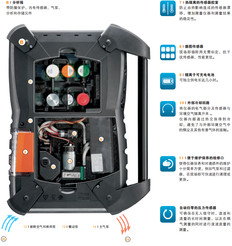 密閉的冷卻回路將儀器元件及傳感器與外部環(huán)境空氣隔離了開(kāi)來(lái)。testo 350 從而可以直接在粉塵和臟污的環(huán)境中使用。儀器外殼堅(jiān)固,集成了防撞保護(hù)功能,確保了運(yùn)輸及攜帶的安全。