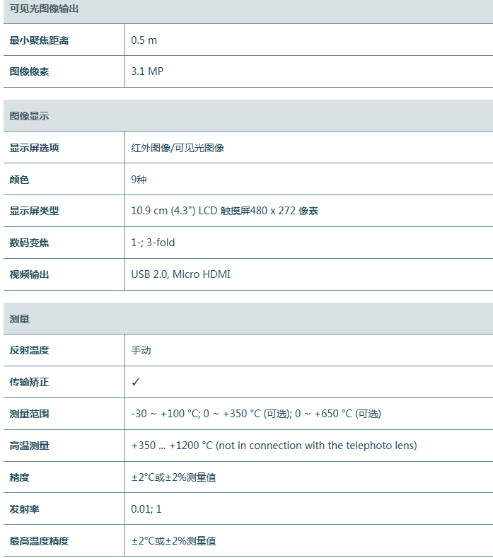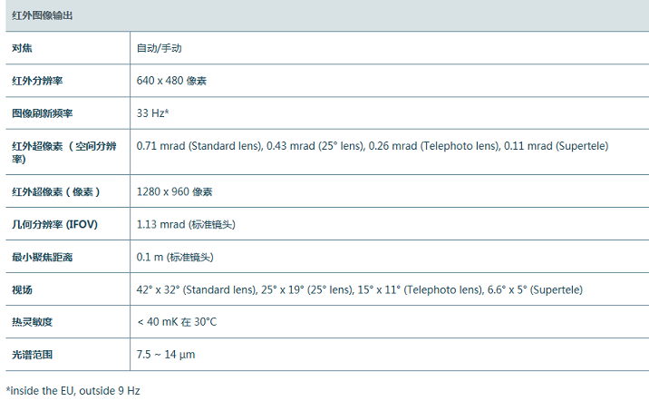 紅外分辨率 640 × 480 像素;采用SuperResolution紅外超像素技術后,可提升至 1280 × 960 像素;熱靈敏度< 40 mK
