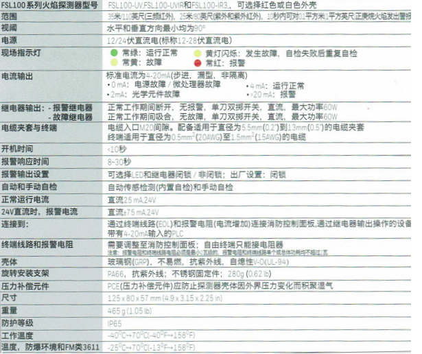 霍尼韋爾 FSL100火焰探測器 產品參數: