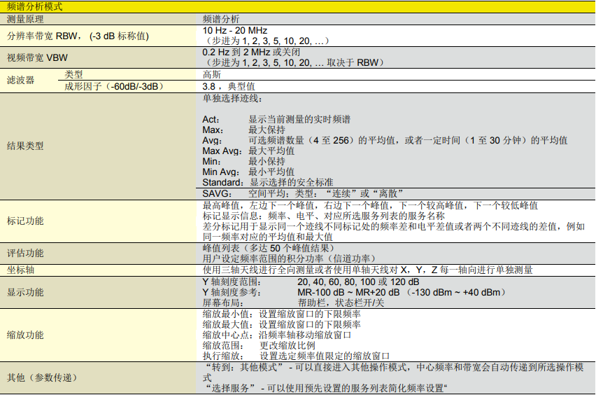 | 評估功能 | 峰值列表(多達50個峰值結果)?用戶設定頻率范圍的積分功率(信道功率) |
