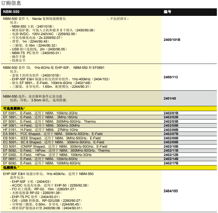 寬頻電磁輻射分析儀 NBM-550 從屬于 NBM-500 系列,能極其準確地測量電磁輻射。探頭覆蓋了從 工頻到微波輻射的所有頻率,通過配備不同類型的探頭可以測量電場、磁場強度,同時配備有普通探頭 和其他基于人體安全標準的計權類型探頭,這些探頭均通過獨立校準,并且使用非揮發性存儲器存儲探 頭參數和校準參數。因此,探頭可以用于任何一款 NBM-500 系列儀器上而不會對校準準確度有任何影響。