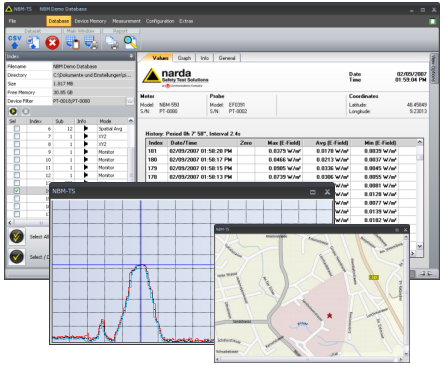 標準采用:當使用計權探頭測量時,通過簡單地設置頻率并選擇 NBM-550 內置的標準(如 ICNIRP 標準),就可得到計權測量結果。如果場強來源主要是已知的某個單一頻率,這種評估非常有用。即使使用普通探頭進行測量,也可以顯示相對于標準限值的百分比結果。