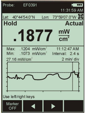 歷史記憶模式顯示場強隨時間變化的曲線,可用標識線讀取顯示特定時刻的場強值