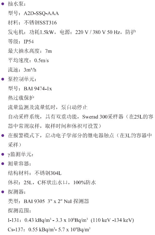 BAI9125水在線監(jiān)測系統(tǒng)就是用于在線連續(xù)監(jiān)測生活飲用水、水庫等水源中的總γ活度,系統(tǒng)構(gòu)成包括:采樣系統(tǒng)、配水及管路清洗裝置、水樣預(yù)處理系統(tǒng)、在線測量儀器、數(shù)據(jù)采集與傳輸系統(tǒng)、信息處理與遠(yuǎn)程監(jiān)控中心系統(tǒng)、站房及輔助設(shè)備。