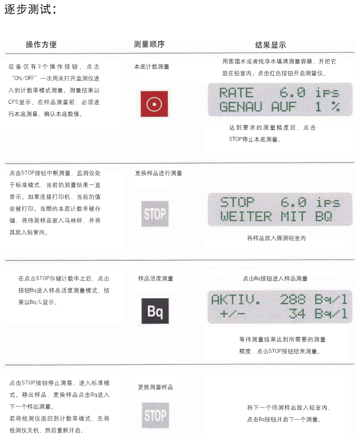 測量結果單位顯示為cps或者經設備計算轉換后為Bq/l內置的微處理器系統程序保證當測量數據變換后,顯示數據會自動調節。