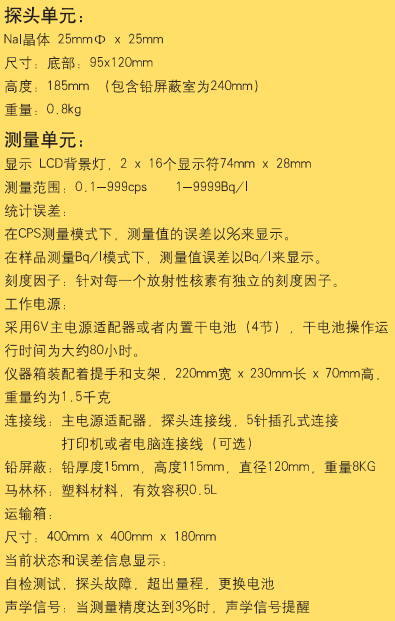 微處理電子學單元允許非專業人員進行直接探測液態和顆粒物中的伽馬放射性濃度,樣品活度的最低下限為20Bq/L或者20Bq/Kg,約為0.5nCi/L