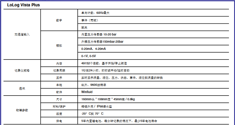 有著先進(jìn)配置和本地顯示的Vista?Plus是一種手動的記錄儀,提供了多輸入兼容性和PDA/PC軟件兼容性。它還可以通過Winfluid軟件編程一個轉(zhuǎn)換表格來顯示轉(zhuǎn)換數(shù)據(jù),比如從深度到流量。