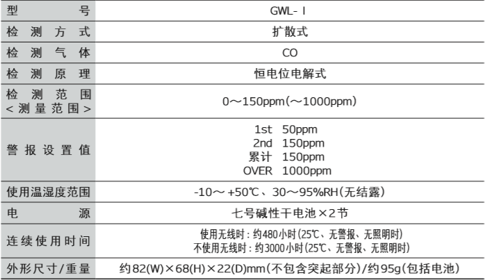 日本RIKEN(理研) GWL-Ⅰ個(gè)人氣體檢測(cè)儀產(chǎn)品技術(shù)參數(shù):