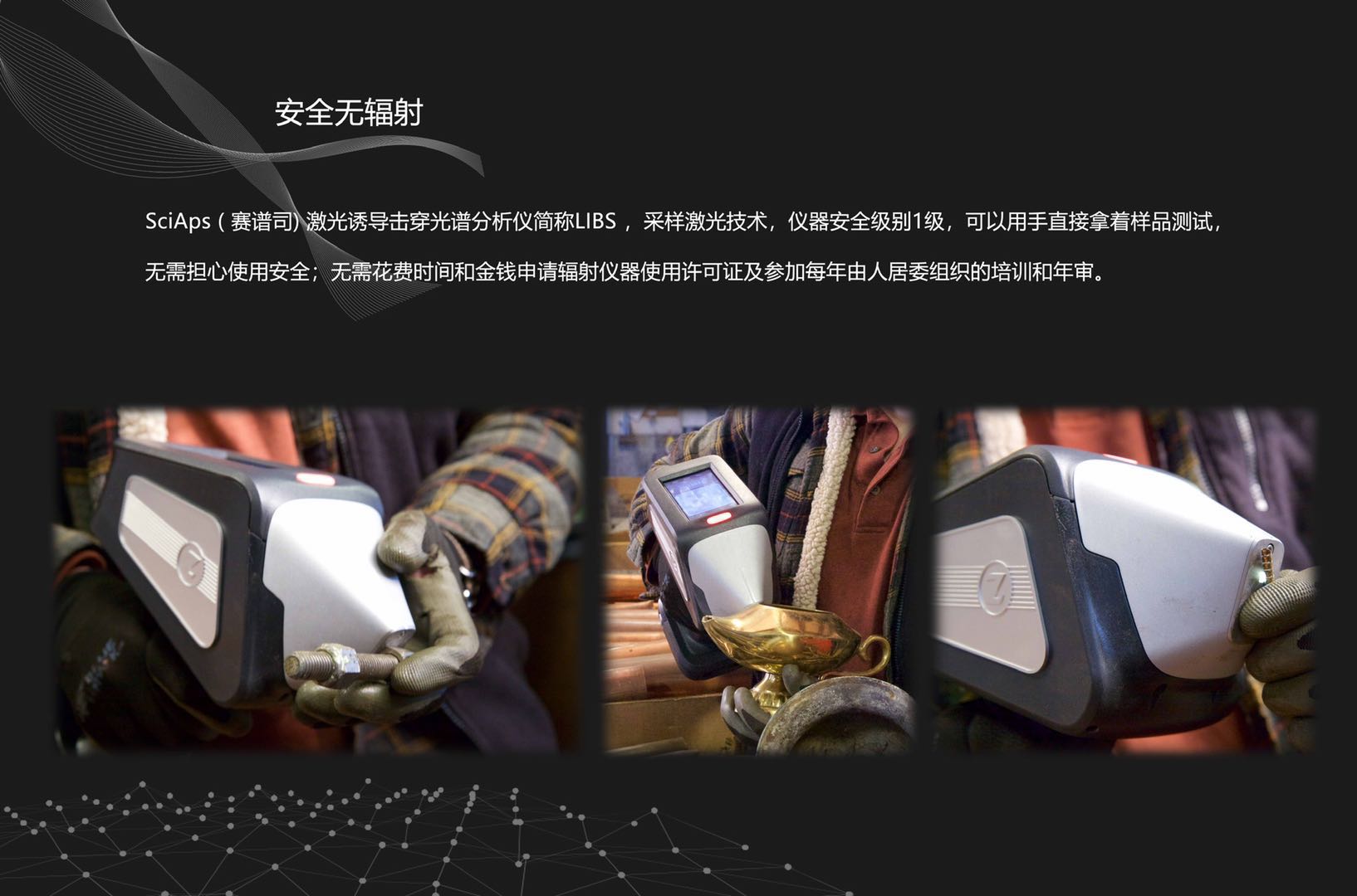 Sciapsa激光合金分析儀采用激光誘導擊穿光諳(LIBS)技術,沒有電離輻射,對眼晴無傷害,不會對使用者造成傷害,無需注冊,不需要向政府申請輻射儀使用許可證無需接受輻射監管,無需向政府提供使用報告或費用。