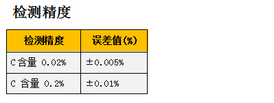 Z-200 C+ 能測不銹鋼和低合金鋼(LAS)中的低C,也能測量鑄鐵中的高C。 測試精度高達±0.005%,測試時間短,完成一個樣品測試需約10-20秒。 即使區分C含量差異為0.1%的碳鋼牌號,也只需10秒或更短的時間。詳細的性能參見下表。