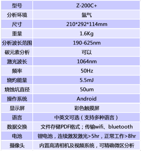 賽譜司LIBS Z-200C+ 激光合金分析儀產品技術參數: