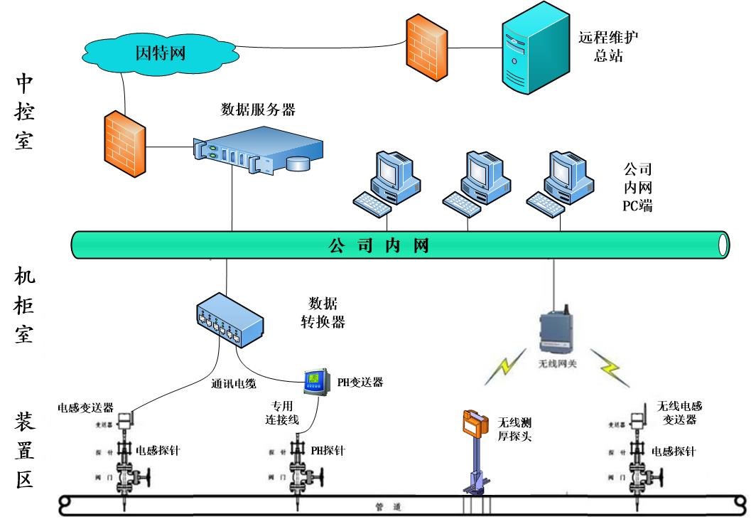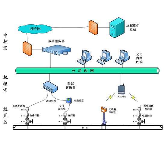 系統基本組成為:腐蝕探針、PH探頭及測厚探頭、數據變送器及測厚節點、數據通訊轉換器、服務器、及專用操作工具包等。
