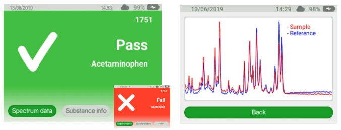 檢驗結果是否通過的指示簡單清晰,非技術人員也能理解。一鍵即可獲得 拉曼光譜和物質信息等其他信息。