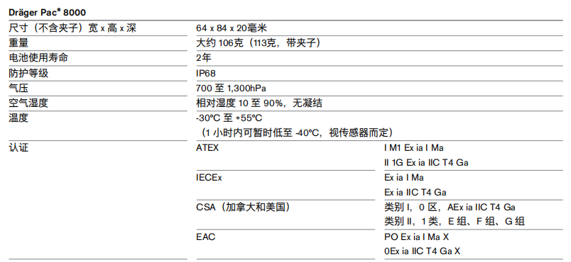 德國DRAGER(德爾格) Pac8000 單一氣體檢測儀 相關參數: