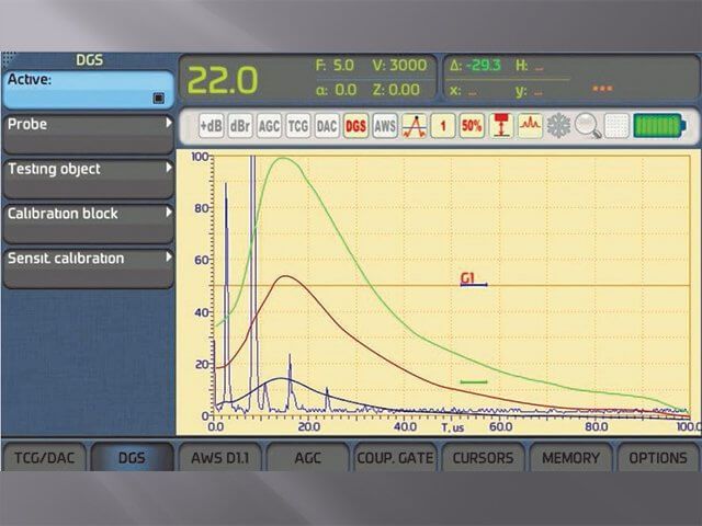 對(duì)于給定的等效直徑(面積),DGS系統(tǒng)允許為直射束和角射束單元件傳感器建立多達(dá)3條DGS曲線。 它還可以直接讀取De 和/或 Se的讀數(shù),以進(jìn)行門控指示。