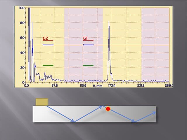 “腿部標(biāo)記”模式更改為A-掃描背景標(biāo)記A-掃描與黃色的下垂腳和粉紅色的下垂腳對(duì)應(yīng)的零件。 這有助于從視覺上估計(jì)引起指示的反射器(缺陷)的深度。