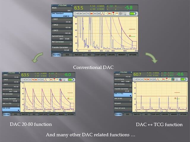 內(nèi)置的DAC系統(tǒng)可根據(jù)以下代碼構(gòu)建DAC曲線:ASME(單曲線和3條曲線),EN 1712,EN 1713,EN1714,JIS Z3060,GB 11345,GB4730。還可提供用戶預(yù)設(shè)。 基本曲線最多可以包含128個(gè)點(diǎn)。 最多可以建立6條其他曲線。 除了在任何DAC系統(tǒng)中使用的所有標(biāo)準(zhǔn)功能外,Sonocon BL還提供諸如“ 20-80”功能,DAC