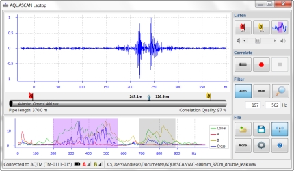 新的高級(jí)算法和功能: AQUASCAN TM2擁有經(jīng)過(guò)全面改進(jìn)的軟件包,具有許多新的和改進(jìn)的功能,使其成為市場(chǎng)上大的相關(guān)器。激活后,“自動(dòng)過(guò)濾器”會(huì)自動(dòng)選擇的頻率,以生成更突出的相關(guān)峰值,即使對(duì)于微弱的信號(hào)也是如此。“Spot Filter”是一項(xiàng)全新的*功能,允許操作員單擊管道中懷疑泄漏的區(qū)域,相關(guān)器專注于該狹窄區(qū)域的噪聲分布。“陷波濾波”功能可消除聲譜中的電源噪聲,包括更高的諧波。操作員可以收聽兩個(gè)傳感器的立體聲音頻,也可以單獨(dú)收聽每個(gè)傳感器的立體聲音頻。此外,新的“過(guò)濾收聽”功能可讓您在應(yīng)用了所選過(guò)濾器的情況下收聽泄漏聲音文件。這非常適合抑制道路交通或電氣干擾等環(huán)境噪聲。