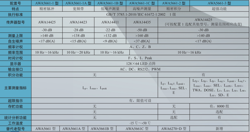 AWA5636型是2級聲級計,適用于一般噪聲測量。由于AWA5636型的配置不同,主要技術性能也有差異,詳情見下表: